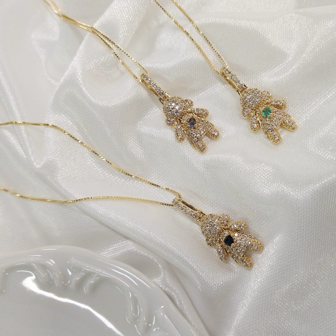 Gargantilha tendo sua corrente lisa veneziana, tendo como pingente uma menina toda cravejada em zircônias e ao centro do pingente uma pedrinha colorida no formato de coração. Banhada a ouro 18k.