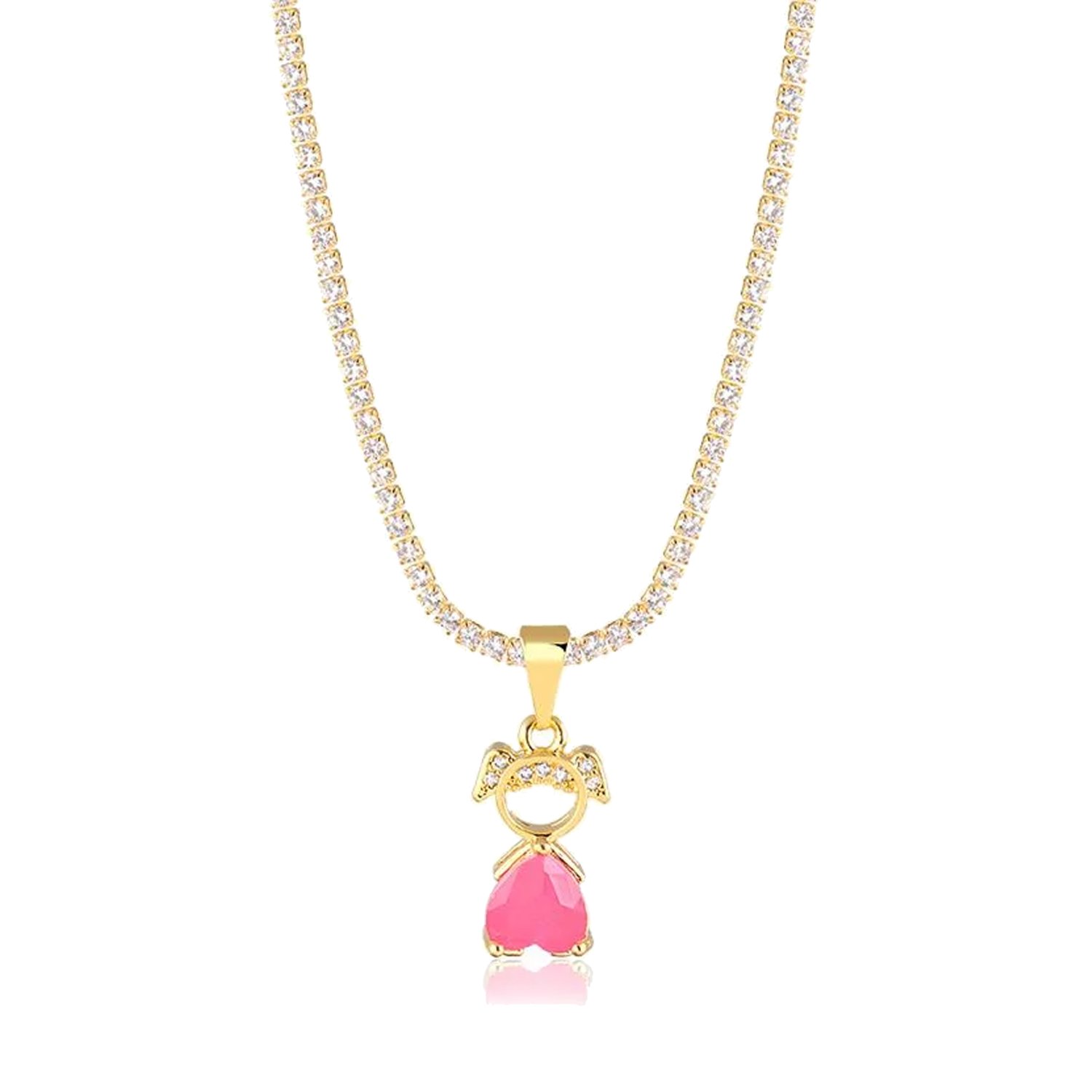 Gargantilha tendo sua corrente toda cravejada de zircônias no modelo riviera. Como pingente uma menina com cabelinho pedras em zircônias e vestido sendo uma pedras rosa. Banhada a ouro 18k.