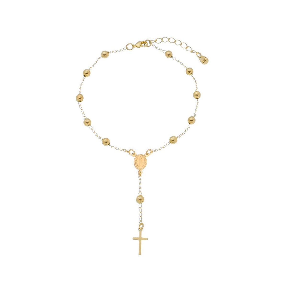 Pulseira terço, banhada a ouro 18k, tendo sua corrente em elos redondos. com entremeios na sua extensão em bolinhas na cor ouro, sendo em formato de terço, tendo uma plaquinha oval na cor ouro, ao centro, tendo levemente em alto relevo a imagem de Nossa Senhora das Graças, e uma cruz fina e delicada ao final do terço, na cor ouro. Pulseira cheia de significado, super delicada, linda e clássica.