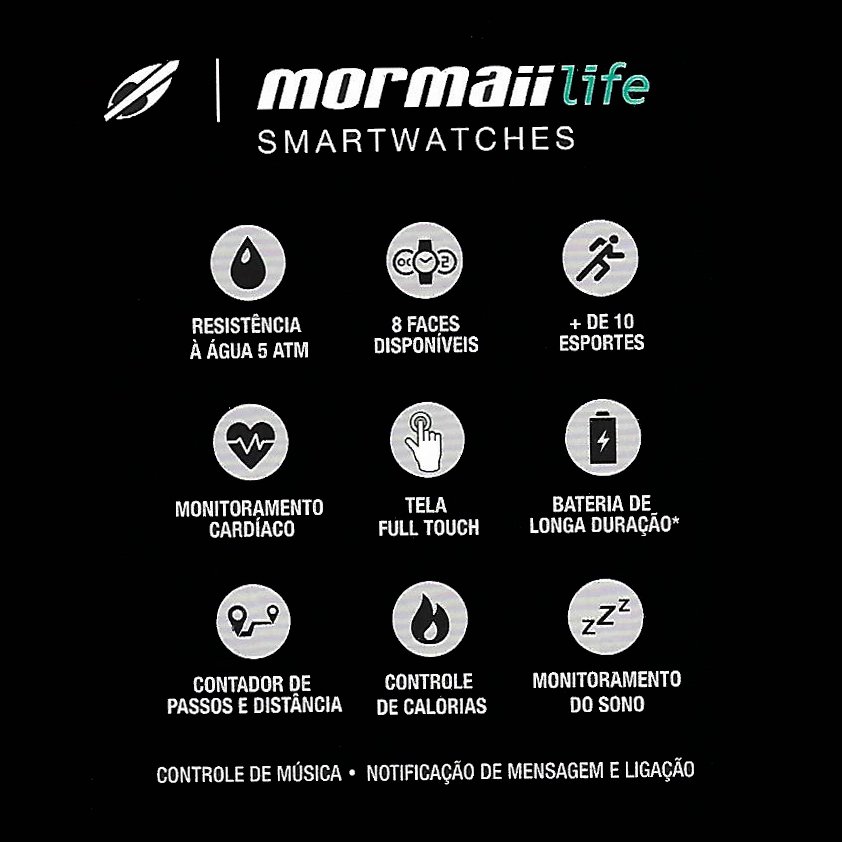 O display apresenta uma boa gama de mudanças visuais com oito mostradores personalizáveis, cada um com indicadores diferentes.O relógio inteligente da Mormaii tem proteção resistente à água de até 50 metros (5ATM) e monitora várias opções de exercícios físicos, dez no aparelho, incluindo esteira, bike, caminhada, ioga e academia, mais 13 pelo app Mormaii Smartwatches, utilizado para o pareamento do relógio com celulares Android e iOS.