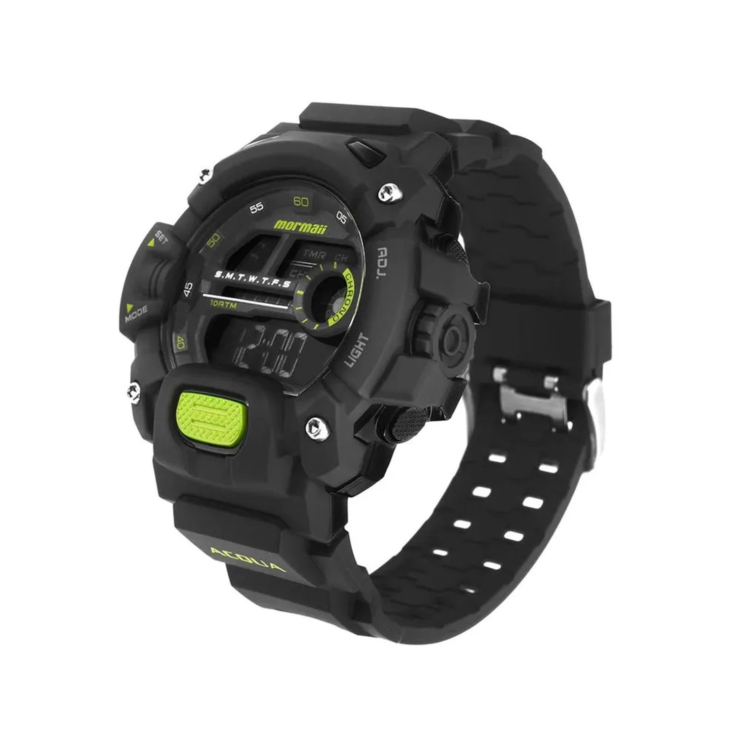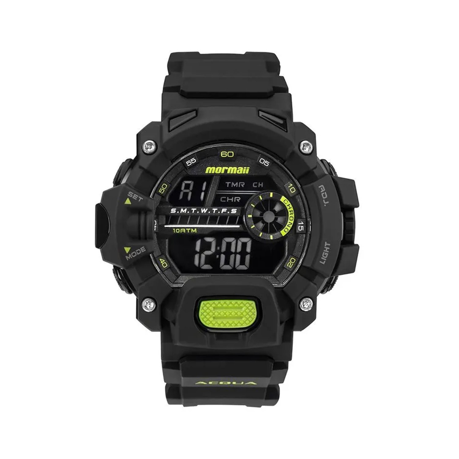 Funções: Digital, Cronógrafo, Alarme, Timer, Calendário, 12/24 h, Iluminação