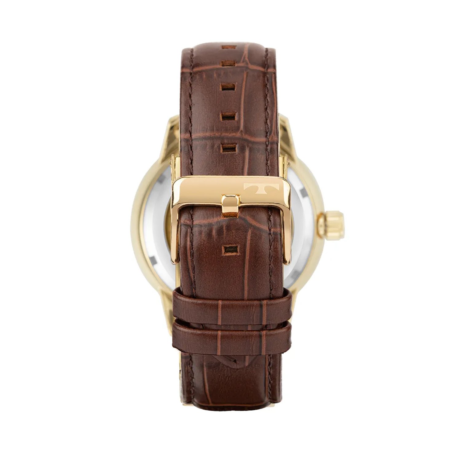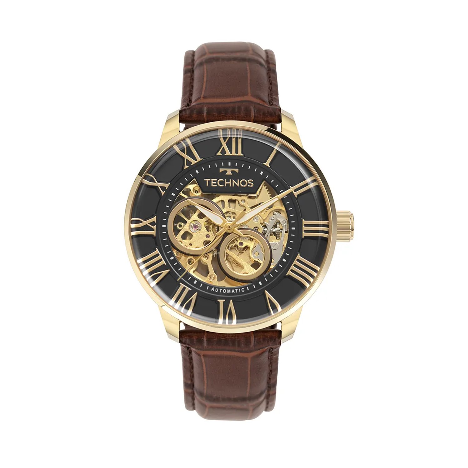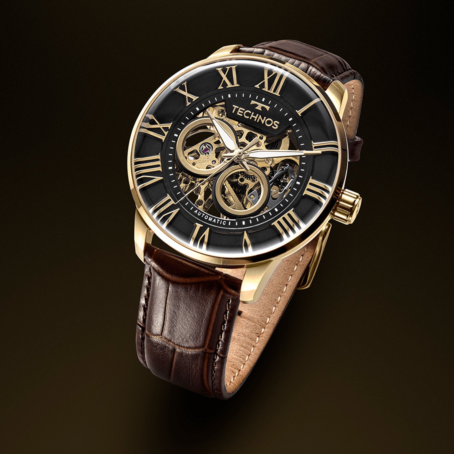 Relógio Technos Automático. Ele representa a essência da tradição relojoeira, com mostrador vazado e fundo de vidro, que deixa seu maquinismo automático skeleton sempre visível. Produto 100% em aço inoxidável em banho dourado, com resistência à água de 100m. Tamanho da caixa 46.
