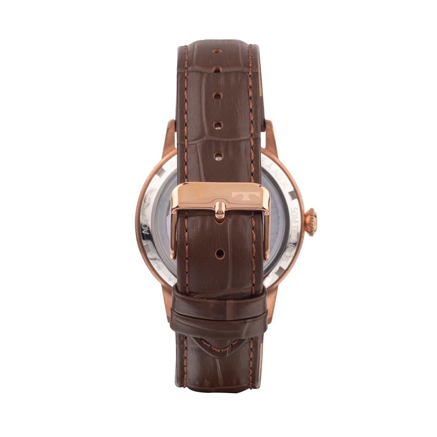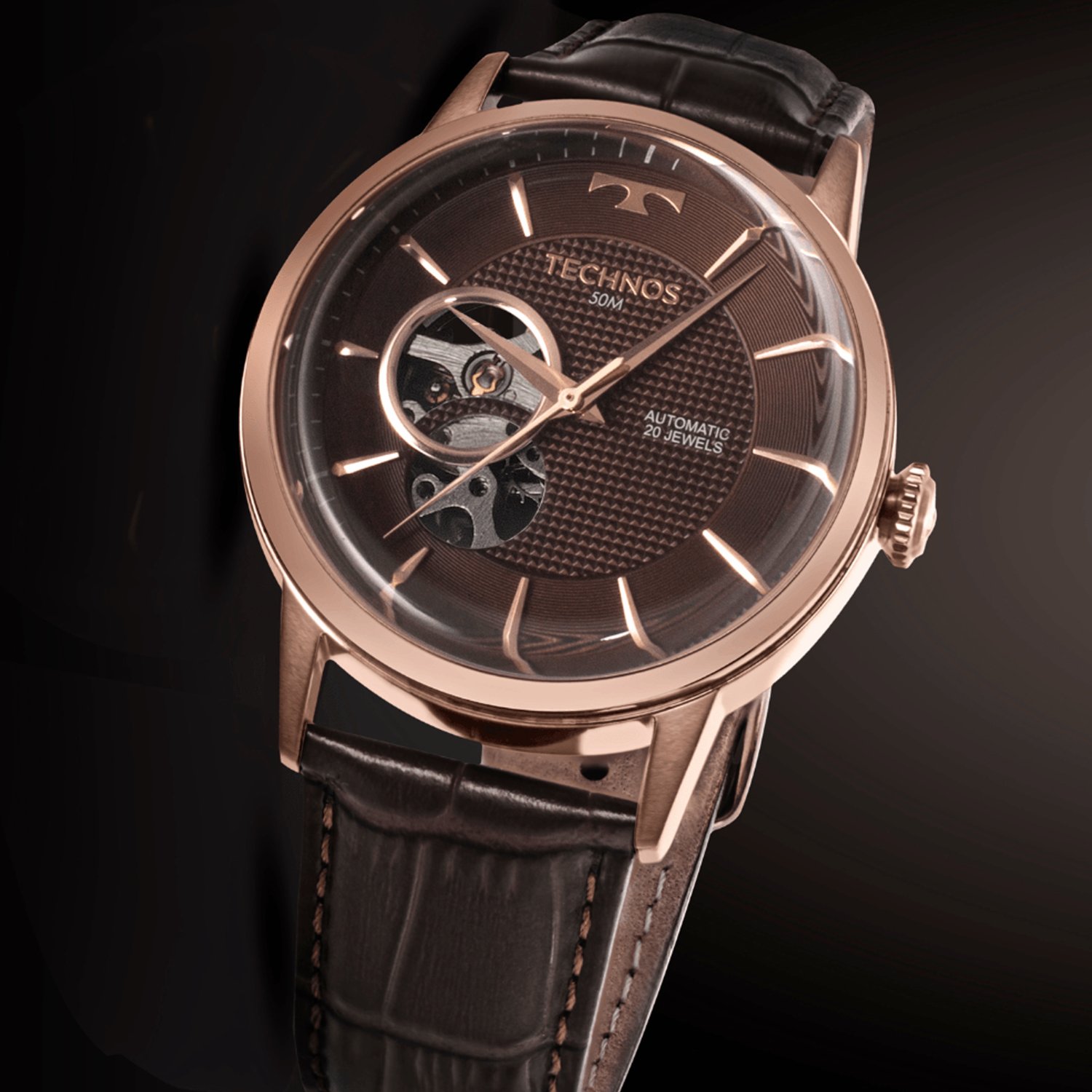 Relógio Technos Automático. Ele representa a essência da tradição relojoeira, com mostrador vazado e fundo de vidro, que deixa seu maquinismo automático skeleton sempre visível. Produto 100% em aço inoxidável em banho dourado, com resistência à água de 100m. Tamanho da caixa 42.
