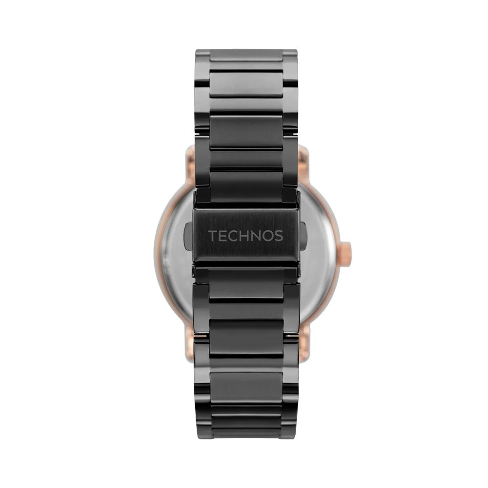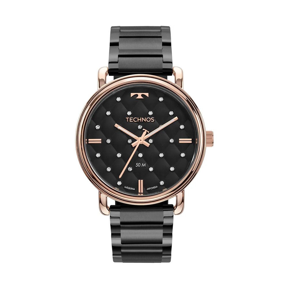 Relógio Technos Trend feminino. Caixa de aço rosé tamanho de 4,0cm. Pulseira em aço preto. Maquinismo analógico. Mostrador em matelassê com cristais aplicados. Resistência à água em até 50 metros.