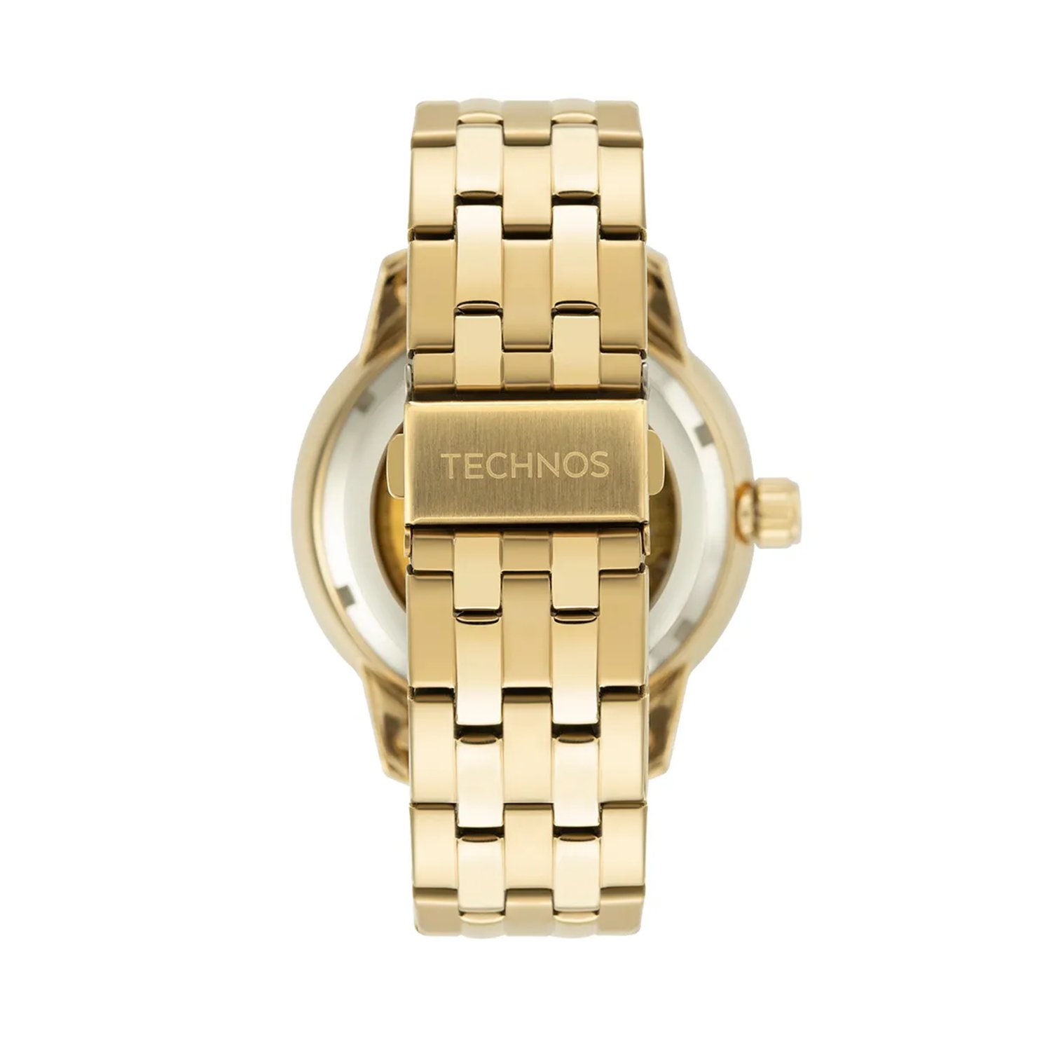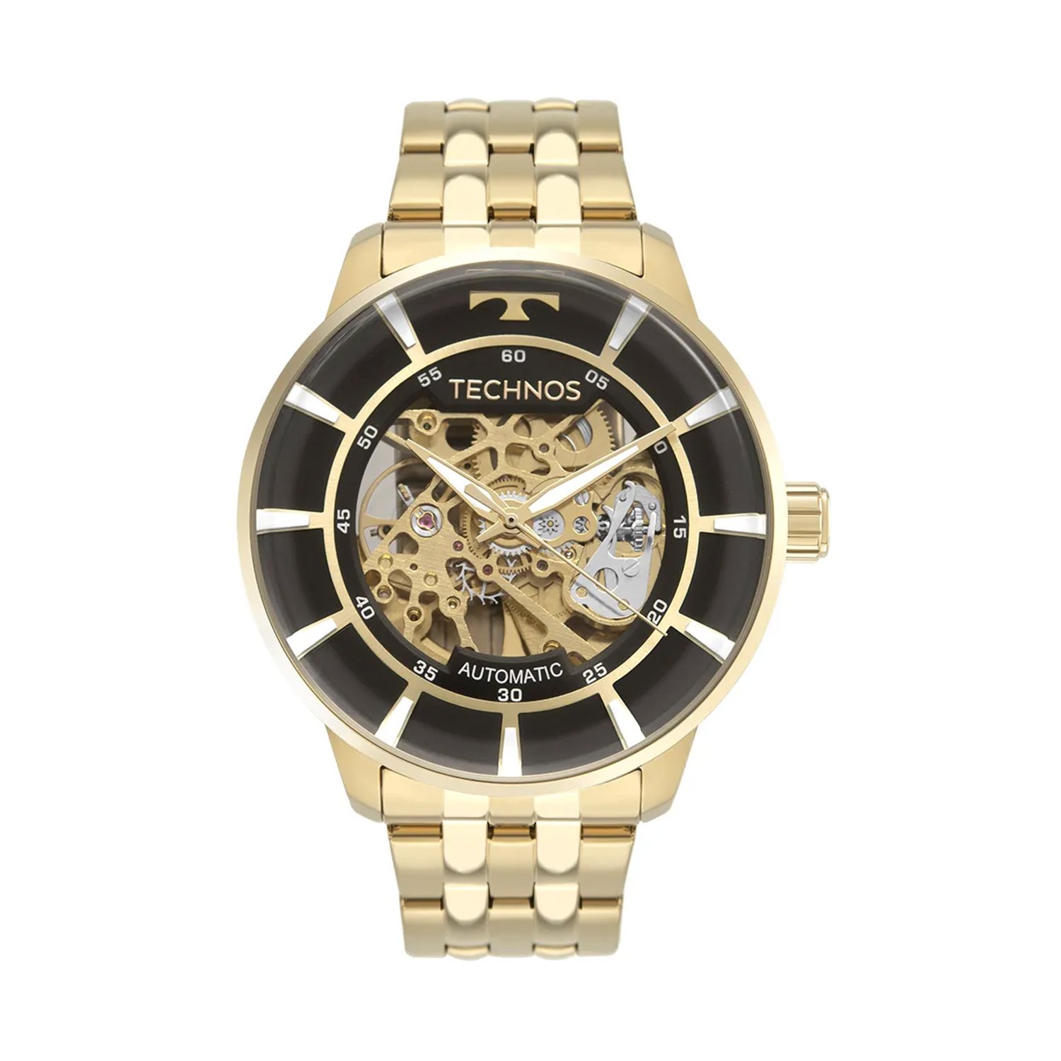 Relógio Technos Automático. Ele representa a essência da tradição relojoeira, com mostrador vazado e fundo de vidro, que deixa seu maquinismo automático skeleton sempre visível. Produto 100% em aço inoxidável em banho dourado, com resistência à água de 100m. Tamanho da caixa 46.