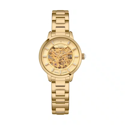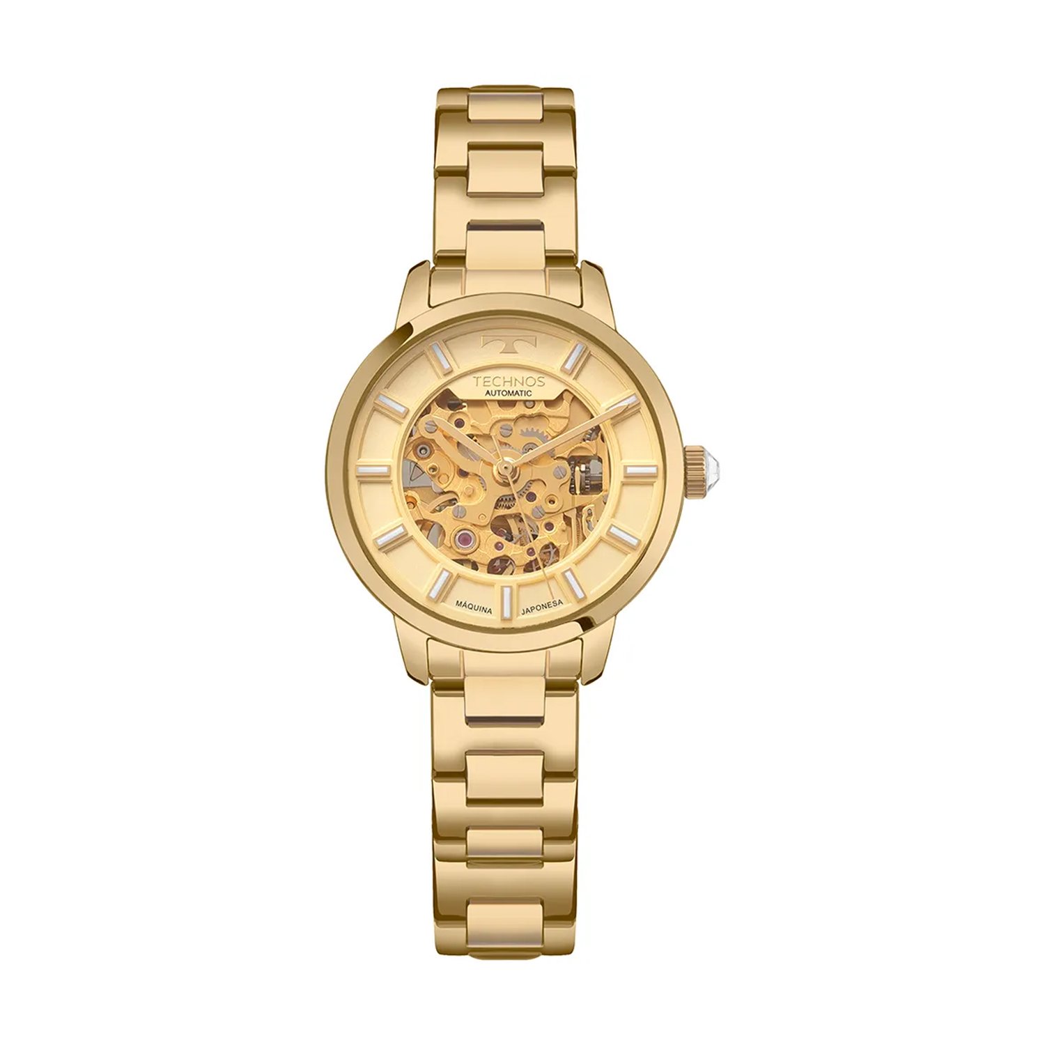 Relógio Technos Automático. Ele representa a essência da tradição relojoeira, com mostrador vazado e fundo de vidro, que deixa seu maquinismo automático skeleton sempre visível. Produto 100% em aço inoxidável em banho dourado, com resistência à água de 100m. Tamanho da caixa 32.
